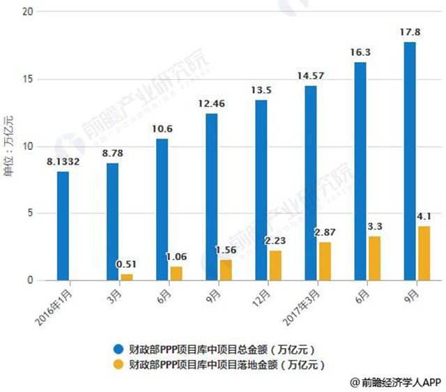 财政部把黑臭水体治理纳入专项基金重点支持范围,从国家层面上对黑臭水体治理进行财政支持。同时2015年以来,从国家到省市,PPP政策密集发布,积极引导基础设施与公共服务的发展。据前瞻产业研究院发布的《中国水环境治理行业市场需求预测与投资战略规划分析报告》统计数据显示,截至2017年9月底,PPP项目入库项目总数为14220个,入库项目总金额为17.8 万亿。同时从2016年1月开始,库中项目个数及金额保持比较平稳的增长速度,项目总量持续增长。