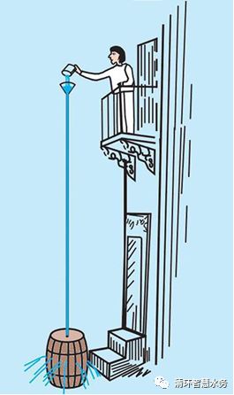 为了这个公式,老帕还专门做了个裂桶实验:在一个密闭的、装满水的木桶的桶盖上插入一根细长的管子,管子非常长,长到老帕要从楼房的阳台上才能够到管子的顶端。老帕向细管子里灌水,结果才灌了了几杯,桶就裂了,被水压的。这个实验在当时被认为是不可思议的,因为它证明了木桶里的水对木桶底部(或侧壁)产生的压力远大于水自身的重量。用帕斯卡的压强公式来解释,那就是水深h很大,导致p很大,于是作用在木桶上的压力就很大,大到足以使木桶开裂。