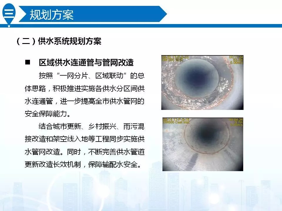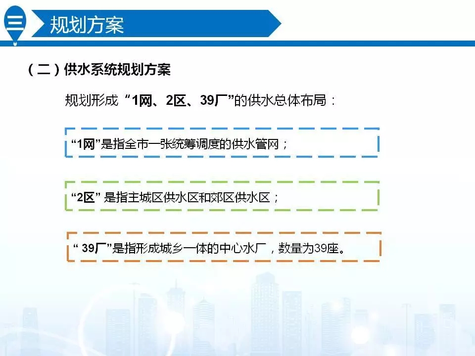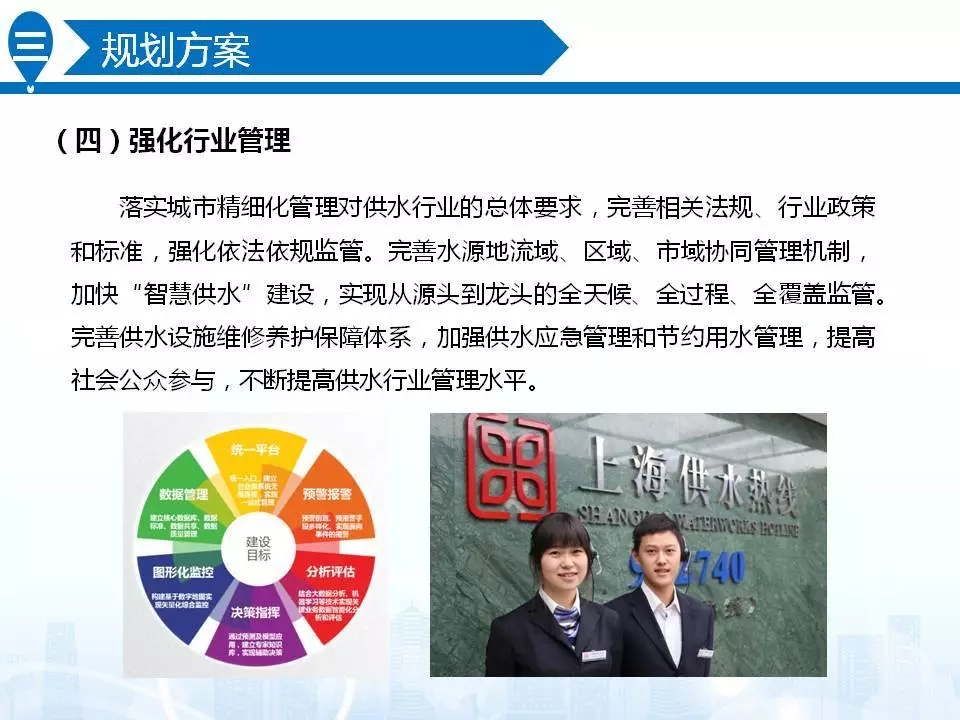《规划》旨在全面提升全市水源、水厂、管网和二次供水四大环节的全过程水量水质监管和安全保障水平:规划标准方面,在执行国家标准的基础上,提出同时执行要求更高的上海市《生活饮用水水质标准》;规划方案方面,充分考虑节约用水、总量控制,形成完备的水厂及供水系统布局、规模和水源地及原水系统布局、规模;管建并举方面,着重强调落实城市精细化管理对供水行业的总体要求,不断提高行业管理水平;实施策略方面,明确了《规划》的近、远期实施计划。