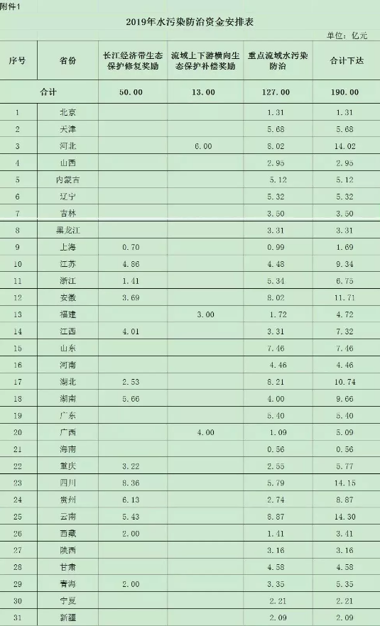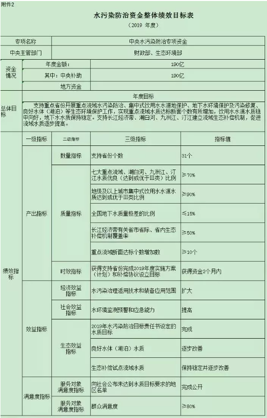 为促进水环境质量改善,贯彻落实《水污染防治行动计划》确定的工作内容,加快推进水污染防治工作,现下达你省(自治区、直辖市)2019年水污染防治资金,用于支持水污染防治和水生态环境保护方面相关工作,并就有关事项通知如下: