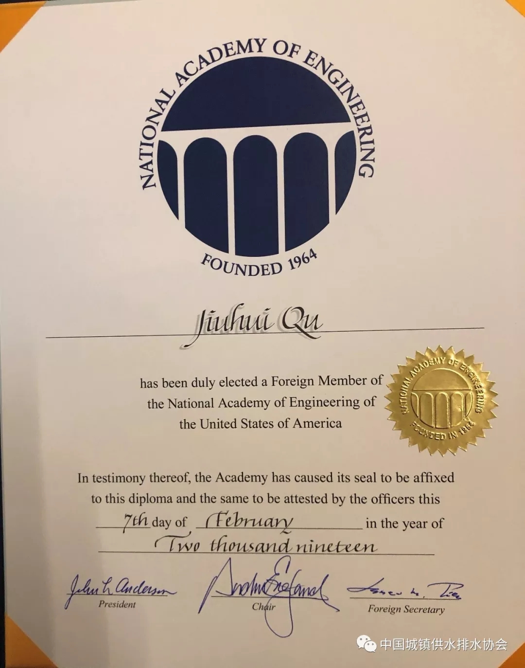 总部位于美国首都华盛顿的美国国家工程院(NAC)于2019年2月7日公布了新晋院士的名单,此次当选者共包括86名院士以及18名外籍院士。中国工程院院士、中国科学院生态环境研究中心研究员曲久辉是新晋外籍院士中唯一的中国学者。 美国国家工程院主席Gordon R. England 曲久辉院士促进水处理技术的发展,对中国水质的改善起领军作用 美国国家工程院院士证书 NAE官网表示,当选为美国国家工程学院院士是工程师所享有的最高专业荣誉之一。旨在表彰“在工程研究、实践或教育领域,也包括对工程文献作出重大贡献”以及“开拓新兴技术领域,传统工程领域取得重大发展,或实施创新工程教育方法”的个人。美国国家工程院(NAE)已经选举出86名新成员和18名外籍成员,这使美国的院士总数达到2297人,外国院士总数达到272人。 Asian Scientist(亚洲科学家)网曾这样介绍:2019年加入NAE的第三位亚洲科学家是中国科学院生态环境科学研究中心的曲久辉教授,他在水处理技术方面取得了重大进展。还因其在改善中国水质方面的领导能力而闻名,他曾是“十五”国家重点科研计划“水污染控制与治理技术与工程”项目的组长。 人物简介 曲久辉,男,1957年10月出生于吉林农安。清华大学环境学院特聘教授,中国科学院生态环境研究中心研究员。2009年当选为中国工程院院士;2014年当选国际水协(IWA)杰出会士(Distinguished Fellow);2015年受聘为桂林理工大学荣誉校长;2018年当选发展中国家科学院院士;2019年当选美国国家工程院外籍院士。 现兼任中华环保联合会副主席、中国环境科学学会副理事长、中国环保产业协会副会长、中国水资源战略研究会副理事长、《环境科学学报》主编等职。 主要从事水质科学、技术和工程应用研究。研究的重点方向包括:①饮用水安全保障。涉及饮用水水质的全过程风险控制问题,提出并特别关注“标准与效应协同控制”新理论和新工艺;②水质净化与能量转化。涉及水中污染物去除与产能同步的原理、方法、材料、反应器与应用问题,重点关注以电子转移为主要机制的污染物产能的物理化学与电化学理论和方法。③水处理过程。涉及絮凝、吸附、膜分离、电化学等方法,提出并努力探索物理-化学耦合的微场构造及水处理颠覆性技术创新。④流域水污染控制与生态修复。涉及天然水体的水质变化规律、复合污染及生态安全问题,提出并深入研究以物质流为主线的“生态通量”与过程调控机制。 曲久辉院士发表SCI收录论文300余篇,出版学术专著3部,获中国和国际授权发明专利80余项;获国家技术发明二等奖2项、国家科技进步二等奖2项、何梁何利奖(个人)1项、省部级科学技术一等奖4项、中国专利优秀奖1项、国际奖2项。