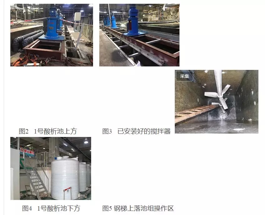 截至2019年5月14日,三期项目整体工程进度已完成70%左右,其中排放系统(废水处理系统)已完成45~50%。事故发生前,1、2、3、4号酸析池上方均已安装好搅拌器,搅拌器采用角钢及铁架固定,未放水进行调试。(现场情况见图2-5)
