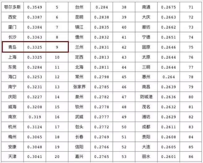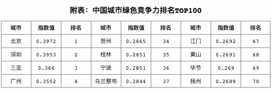 位列前20的城市依次是:北京、深圳、三亚、广州、鄂尔多斯、西安、厦门、长沙、青岛、上海、东莞、海口、南宁、庆阳、威海、南京、杭州、梅州、安康和天津。今年的报告共对290个城市的绿色竞争力进行了科学测算和评估。