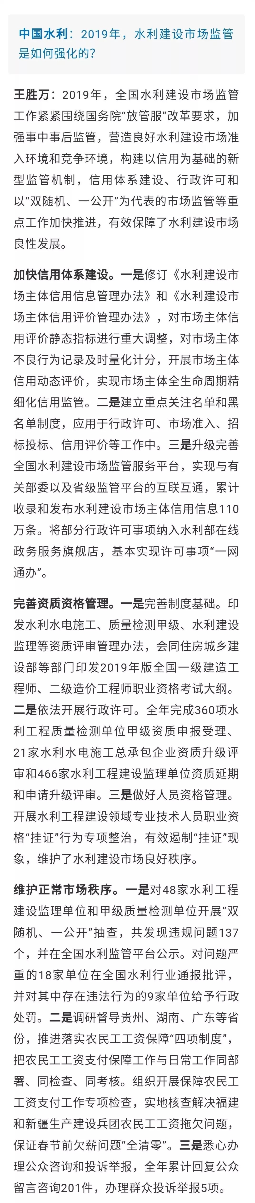 2019年是全面贯彻落实“水利工程补短板、水利行业强监管”水利改革发展总基调的开局之年,水利工程建设工作围绕水利中心工作,坚持目标引领和问题导向,加快推进重点水利工程建设实施,有效管控工程建设质量,大力提升工程建设水平,积极引导水利建设市场良性发展,推动了水安全保障水平明显提升。日前,本刊记者专访了水利部水利工程建设司司长王胜万。