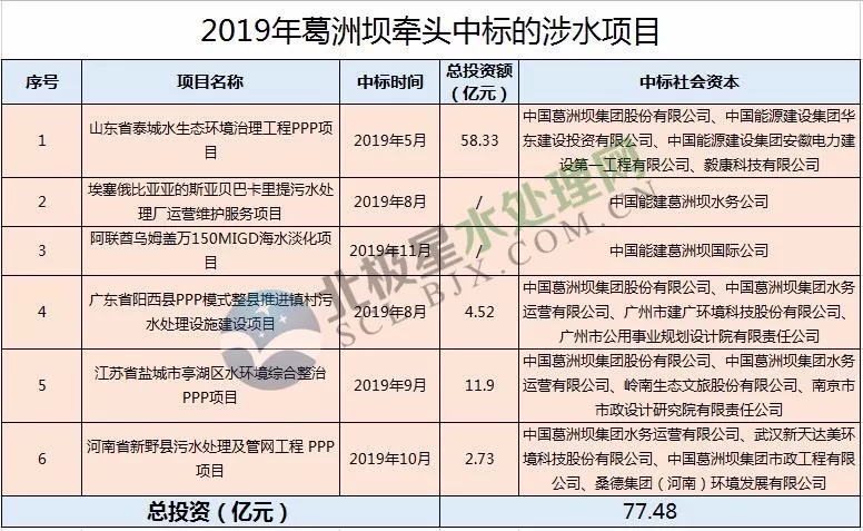 据北极星水处理网不完全统计,2019年,葛洲坝牵头中标的涉水项目总投资逾77亿元,参与中标的重大涉水项目总投资128.95亿元,牵头+参与的重大涉水项目总投资逾205亿。