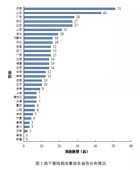 在地下管线破坏事故方面,2018年10月-2019年9月事故发生较多的省份为河南省、山东省、广东省和江苏省,其事故数量分别为35起、25起、18起,占比分别是12.11%、8.65%和6.23%。