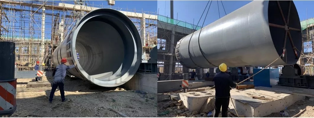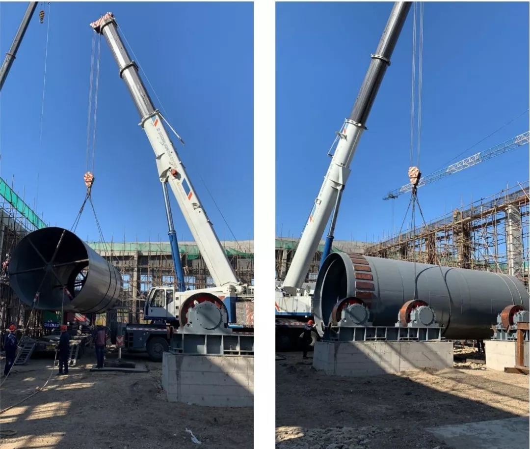 污泥多段回转发酵舱是通过好氧性微生物的新陈代谢作用,使污泥中的有机物转化成富含植物营养物的腐殖质,反应的最终代谢物是二氧化碳、水和热量,大量热量使物料维持一定的高温,降低物料的含水率至40%以下,有效地去除病原体、寄生虫卵和杂草种子,使污泥达到减量化、稳定化、无害化、资源化目的。本次污泥处理工程中,污泥发酵舱处理能力为40吨/日污泥,配置两台Φ3.8×39m多段回转发酵舱,单台发酵舱重量约243t,发酵舱倾斜角度为1.5°,两挡支撑,传动方式为大齿圈传动,变频调速。 发酵舱筒体吊装主要特点有:设备重量大、起吊重量重、作业空间小、安装精度高。此次吊装采用150吨吊车进行吊装作业,是污泥处理工程的重点和难点。为实现此次重大节点,包括牙克石住建局副局长李晓林、蒙晟公司副总经理许海等业主单位、监理单位、施工单位负责人亲临施工现场指挥作业,项目部全体员工听从指挥,积极配合,迅速响应上游单位的各项要求,充分协调整合各类资源,做好吊装前各项施工准备工作,包括制定专项方案、进行安全技术交底等,为此后设备顺利吊装打下了坚实基础。