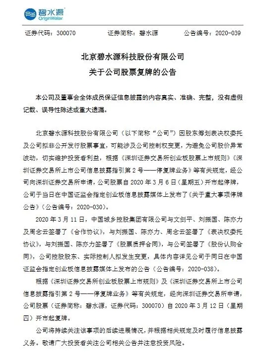 经向深圳证券交易所申请,公司股票自2020年3月12日(星期四)开市起复牌。