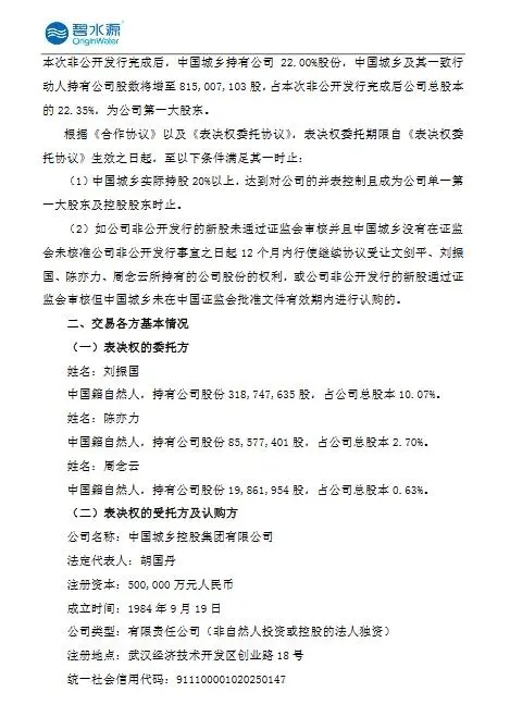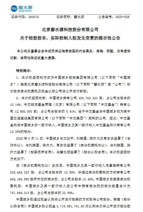 碧水源公布,2020年3月11日,中国城乡与文剑平、刘振国、陈亦力及周念云签署了《合作协议》,与刘振国、陈亦力、周念云签署了《表决权委托协议》,与刘振国、陈亦力签署了《股票质押合同》,与公司签署了《股份认购合同》,此次权益变动方式如下: