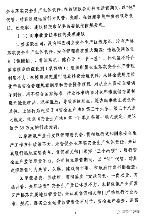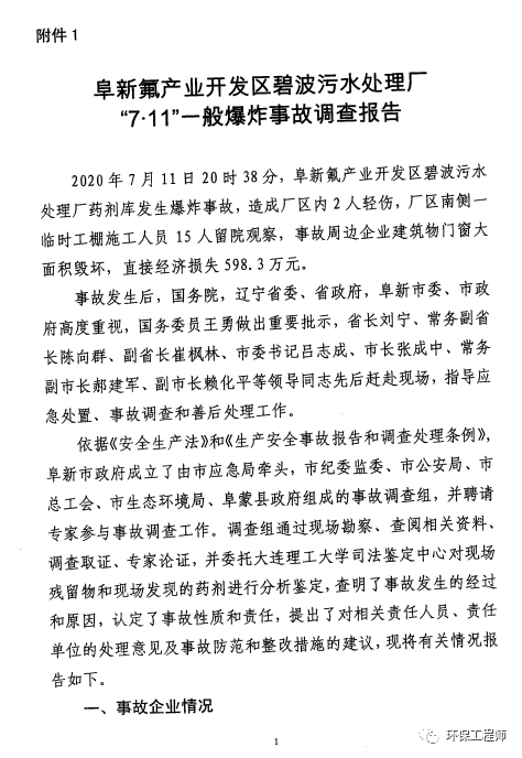近日,从阜新市应急管理局官网看到公布的《阜新氟产业开发区碧波污水处理厂“7.11”一般爆炸事故调查报告》,2020年7月11日,辽宁阜新氟产业开发区碧波污水处理厂药剂库房发生爆炸事故,事故导致2人轻伤,直接经济损伤598万余元,并对主要负责人依法追究刑事责任。