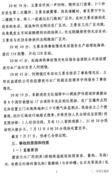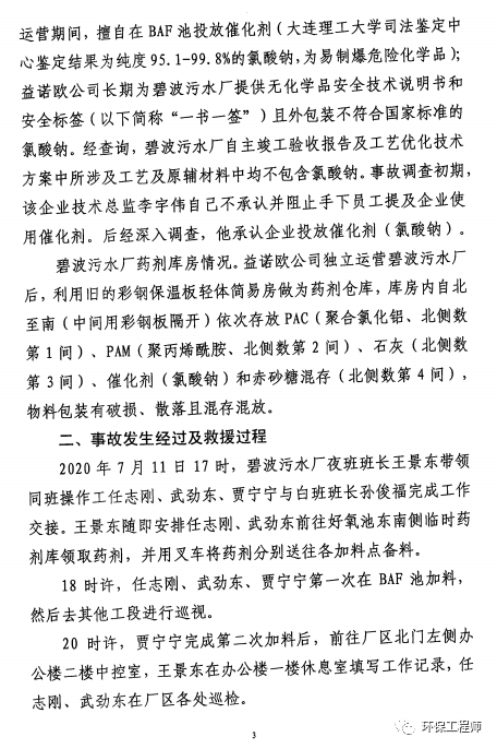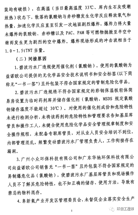 事故调查报告中称碧波污水处理厂擅自向BAF池投加催化剂氯酸钠,催化剂氯酸钠的存放与其他药剂混放,散落的催化剂氯酸钠与其他药剂发生化学反应发生爆炸!
