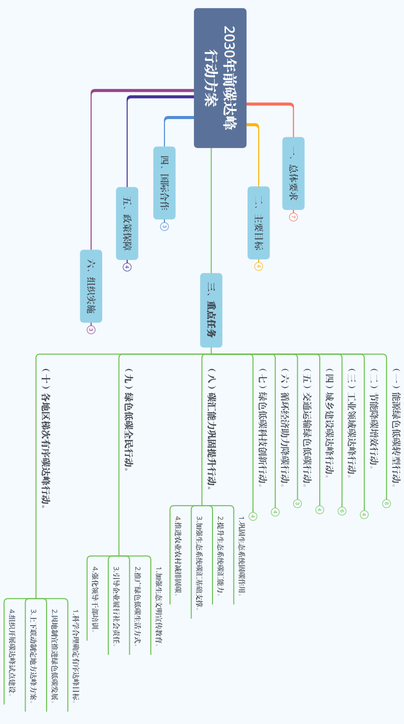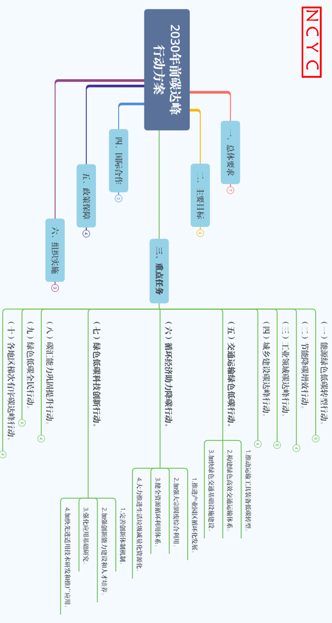 2021年10月26日,国务院向各省、自治区、直辖市人民政府,国务院各部委、各直属机构印发了《2030年前碳达峰行动方案》。该方案从六大方面部署了扎实推进碳达峰行动相关工作,其中第三部“重点任务”中涉及能源转型、工业行业、城乡建设、交通运输、循环经济等“碳达峰十大行动”,共53个具体任务,将碳达峰贯穿于经济社会发展全过程和各方面。在此基础上,国家长江中心梳理了该方案的思维导图,供大家参考。
