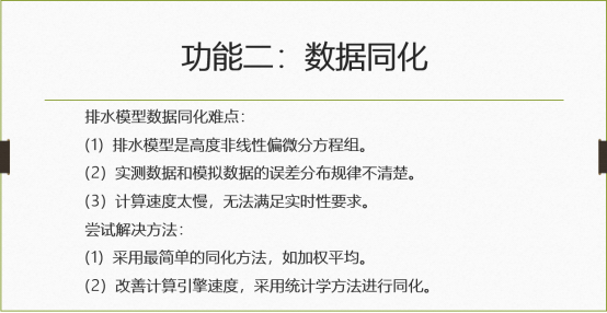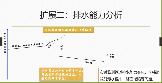 我们对这个问题研究了很久,也取得了一些进展,论文也已经被期刊接收。排水能力分析本来是一个离线分析功能,但后来研究发现,可以用到实时模型里面。对于一个已经建成的老城区,它的污水管网系统状态应该是比较稳定的,污水管道的排水能力衰减是缓慢的。但是,如果某段管道的排水能力发生突变(当然需要经过长期运行来确定什么样的变化叫做突变),就可以认为这个地方出现了问题。那会有什么问题呢?有可能是存在污水非法接入,也有可能是管道被堵,而且突然被堵,那就有可能是管道周围的土壤经过管道破损点进入管道,这是城市道路路面塌陷的先兆。实际上,我们现在城市道路塌陷,90%以上都是因为排水管道把道路下面的泥沙带走所导致。泥沙进入管道,必然会影响管道排水能力,如果能够排水模型调的比较好,让模型长期运行,我们就有可能通过实时排水模型对地面塌陷进行预警。