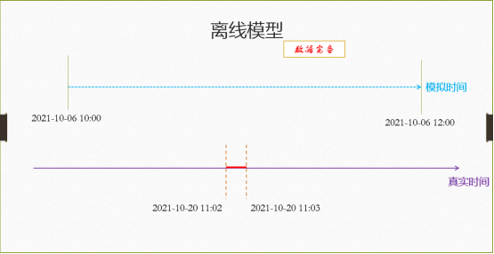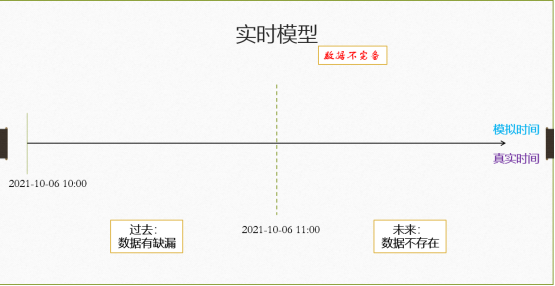但是,我们在实时模型中做不到这一点。因为实时模型有一个特点,那就是实时性,它要求模拟时间和现实时间要基本吻合(可能会有一点点延迟)。比如说,现在是8点50,那么实时模型获取的在线数据,只能是8点50之前的数据,9点钟的数据肯定没有,因为现实时间还没到9点钟,不可能会有9点钟的数据。这就是我们实时模型和离线模型最大的区别:实时模型只能获取已经过去的实时数据,得不到未来的实时数据。