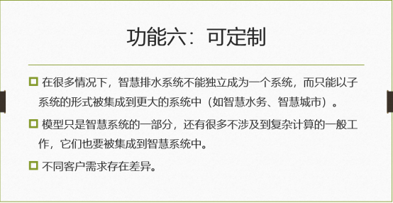 目前,我国很多大型水务公司,已经初步建成了智慧水务系统框架,也实现了不少管理功能的在线化。模型是智慧水务系统的重要组成部分(甚至可以说是灵魂),但它仍然需要和现有其他功能进行融合。因此,模型算法或产品必须要能被集成到更大的系统中,也就是说必须要支持定制功能。