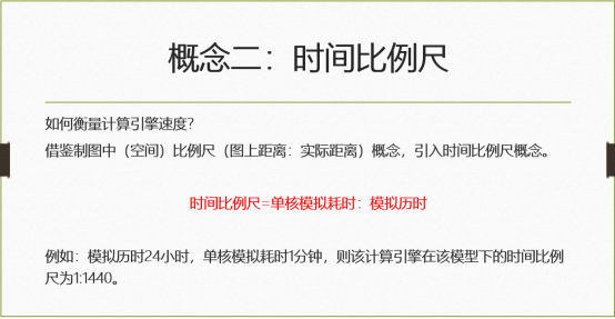 设计师在工程制图中会用到空间比例尺的概念。我们参照它,提出时间比例尺的概念。时间比例尺的定义是:以单线程方式运行模型,模拟耗时与模拟历时之比。例如:模型模拟历时为24小时,以单线程方式运行,耗时1分钟,那时间比例尺就是1:1440。