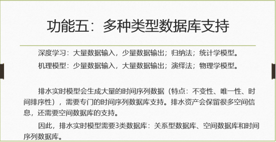 排水资产和空间信息紧密相关,因此一定需要空间数据库。同时,也需要传统的关系型数据库。除此之外,实时模型还需要时间序列数据库。