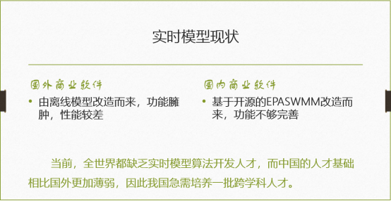 排水实时模型在全世界范围内,都是一个比较前沿的东西。虽然说市场上有很多人,都在号称做实时模型,但实际上做的东西,离真正的实时模型还有很大的差距。目前国外的商业软件,很多地方用了之后,发现也还是用不起来,它也没有解决这个问题。在这样一个背景下,我们在过去几年时间里,一直致力于开发国产的排水实时模型,目前也有了一些成果。今天的报告就是把我们目前的成果和开发过程中的一些思考,进行一个简单的交流。