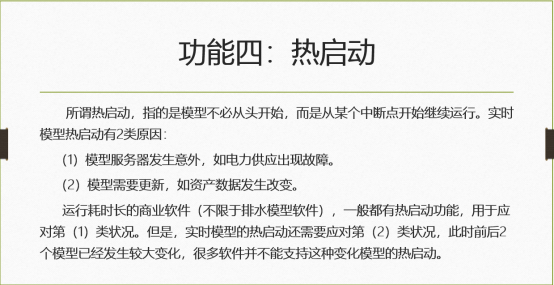 但是,排水实时模型,和一般的流体力学模拟软件又有所不同。第一种情况,热启动前后模型资产数据保持不变。第二种情况,模型资产数据需要更新,热启动前后模型资产数据则会发生变化。很多软件仅能支持资产数据不变时的热启动,却不能支持资产数据可变时的热启动。目前,我们已经解决了第二种情况下的热启动问题。
