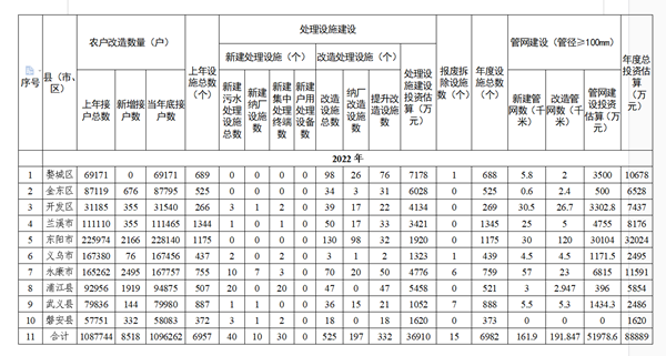 2022年,全市新建改造农村生活污水集中处理设施362个,新增纳厂设施207个,新增受益农户8518户;农村生活污水治理行政村覆盖率达到84%,出水水质达标率达到76%;实现既有处理设施标准化运维全覆盖。