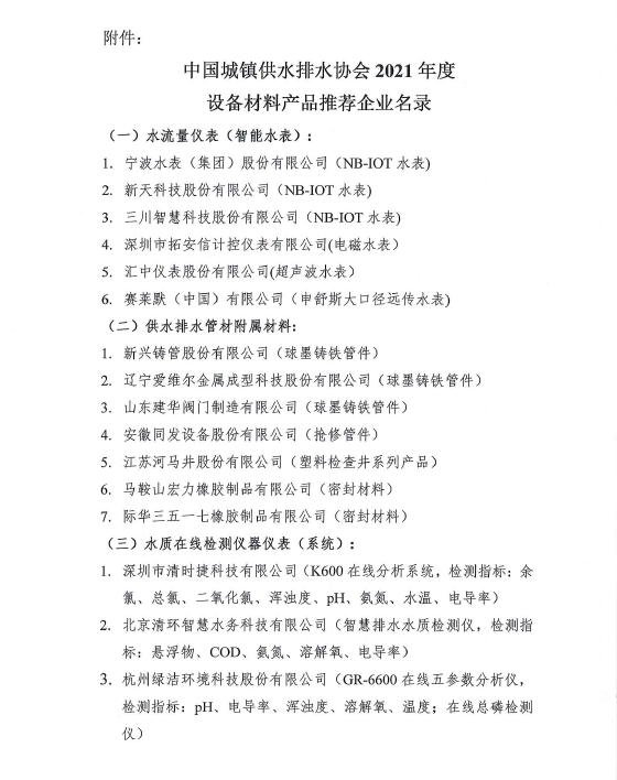 公告丨关于中国城镇供水排水协会2021年度设备材料产品推荐的公告