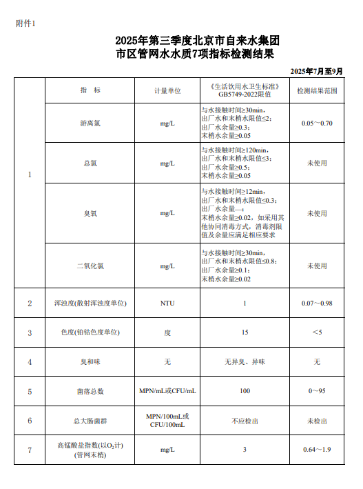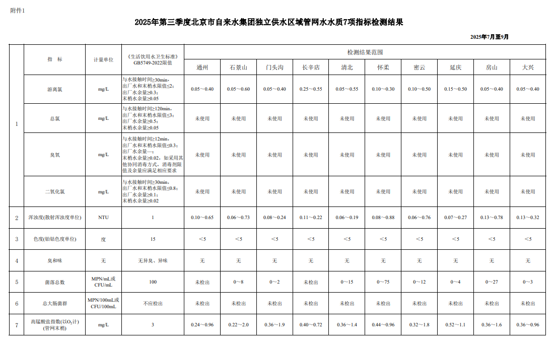 2025年第三季度北京市自来水集团市区管网水水质7项指标检测结果