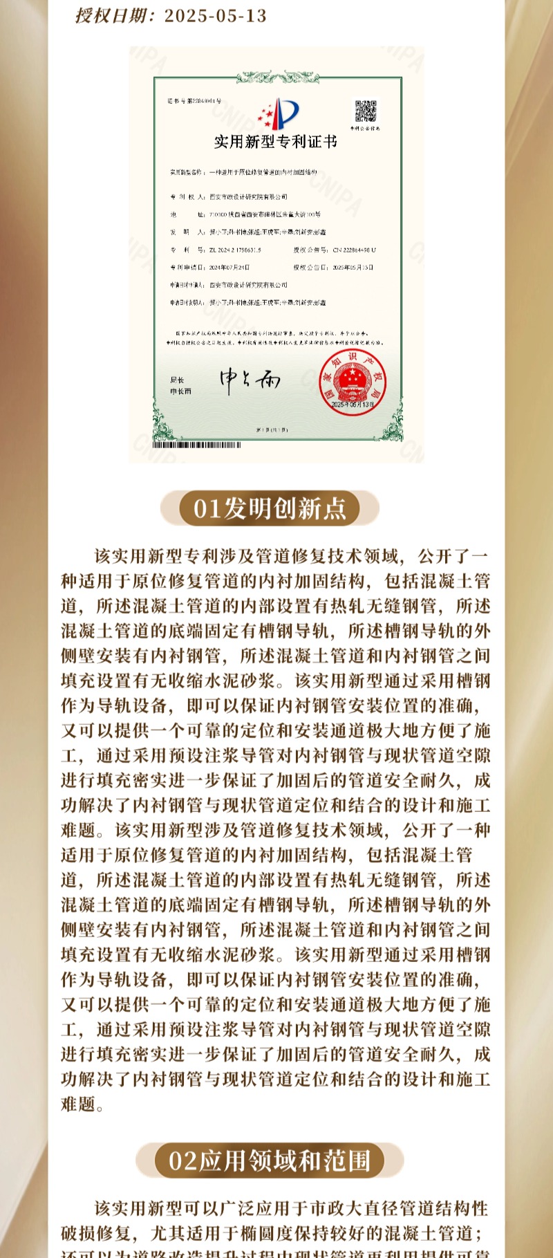 “九通杯”专利展播|贺小卫,等:一种适用于原位修复管道的内衬加固结构