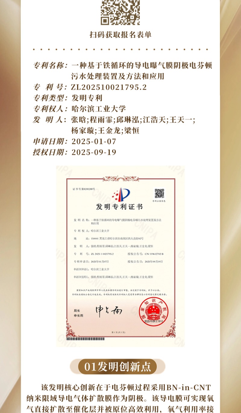 “九通杯”专利展播|张晗,等:一种基于铁循环的导电曝气膜阴极电芬顿污水处理装置及方法和应用