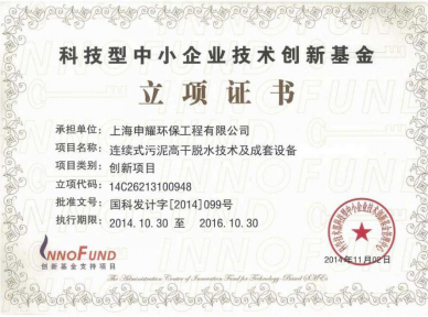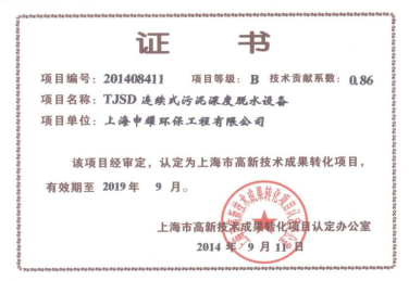 本项目采用的TJSD连续污泥深度脱水技术为同济大学专家学者针对国内污泥处理处置现状及市场需求开发的最新污泥机械化减量及稳定技术,可将含水率80%左右的一次脱水污泥深度脱水至含水率60%。该技术已获10多项国家发明及实用新型专利,获得国家创新基金资助,并被列入“上海市高新技术成果转化项目”。
