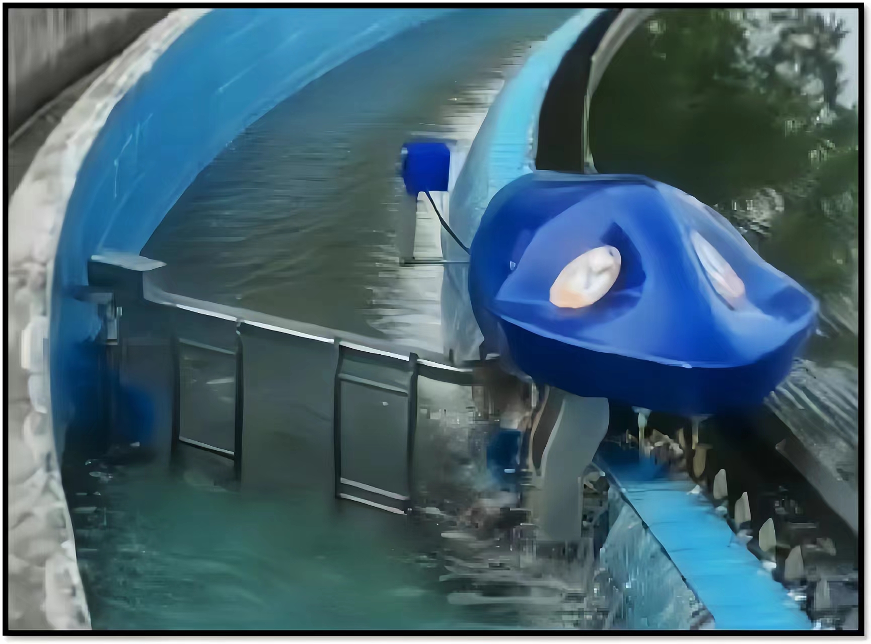 4、清洗机器人具有仿生功能,摇臂主毛刷随输水道外侧渐开线池壁宽窄变化自动调整,使被清洗的曲线弧面更加干净、彻底。