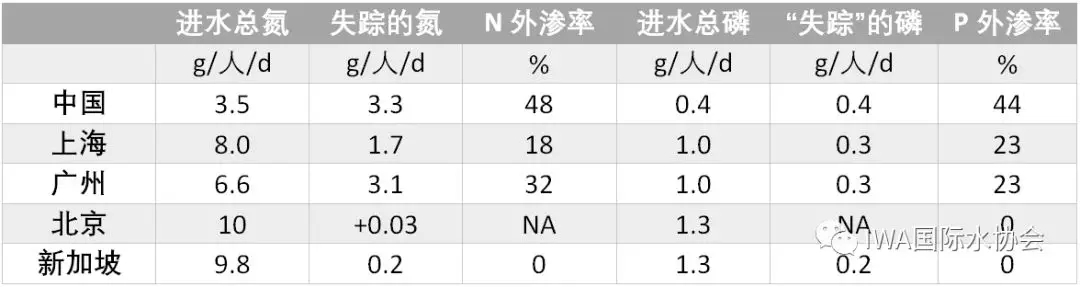 初步计算反映了中国污水管网存在严重的渗漏问题。在这次研究里,他们专门考察了北京、上海和广州的情况,并和新加坡进行对比。下表是人均用水和渗漏对比的概况,统计的都是处理量在10万m³/天以上的污水厂。