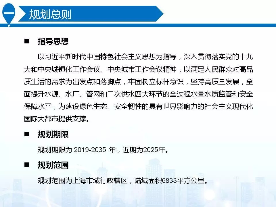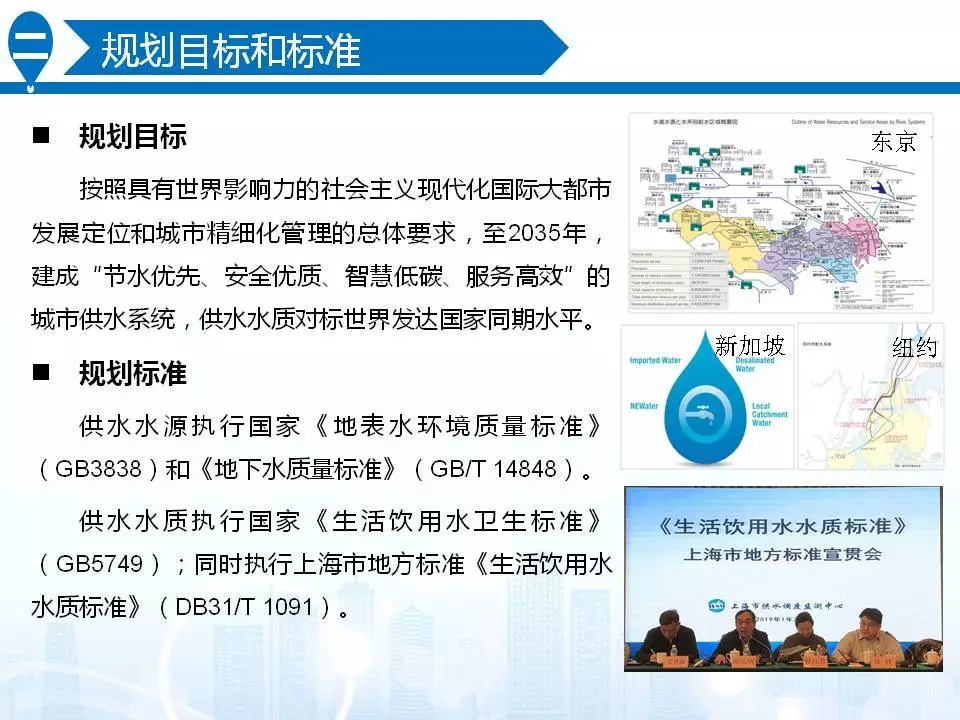 《规划》提出了本市供水系统规划目标,即按照具有世界影响力的社会主义现代化国际大都市发展定位和城市精细化管理的总体要求,至2035年,建成“节水优先、安全优质、智慧低碳、服务高效”的城市供水系统,供水水质对标世界发达国家同期水平。