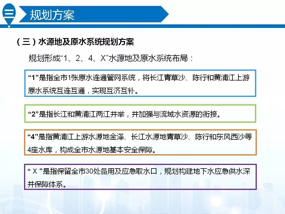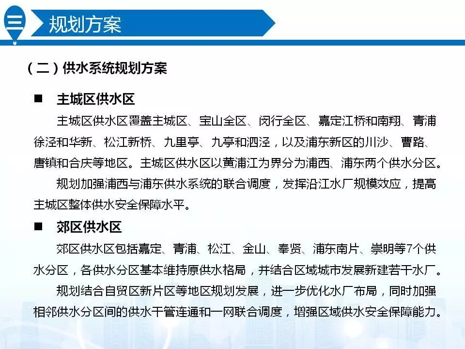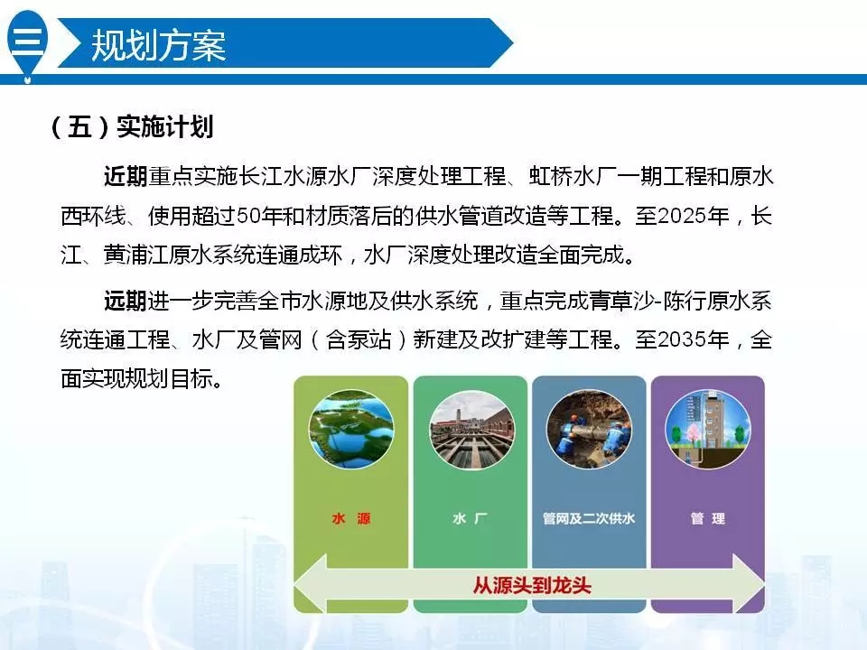《规划》旨在全面提升全市水源、水厂、管网和二次供水四大环节的全过程水量水质监管和安全保障水平:规划标准方面,在执行国家标准的基础上,提出同时执行要求更高的上海市《生活饮用水水质标准》;规划方案方面,充分考虑节约用水、总量控制,形成完备的水厂及供水系统布局、规模和水源地及原水系统布局、规模;管建并举方面,着重强调落实城市精细化管理对供水行业的总体要求,不断提高行业管理水平;实施策略方面,明确了《规划》的近、远期实施计划。