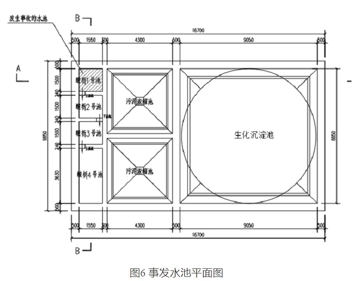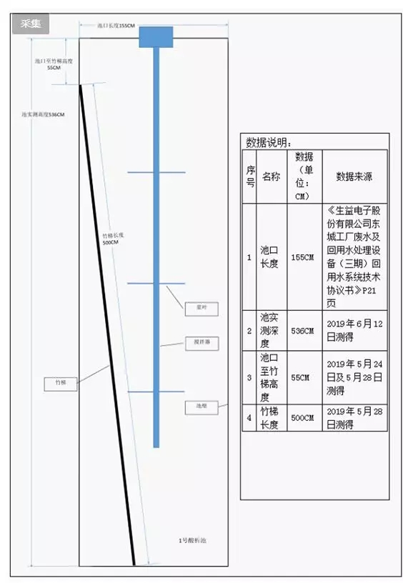发生事故的酸析池为1号酸析池(平面图见图6),经现场勘察,池内有长约5m的普通竹梯,竹梯底部无防滑措施,竹梯顶部距离1号酸析池池口约0.55m。(现场勘察图见图7)