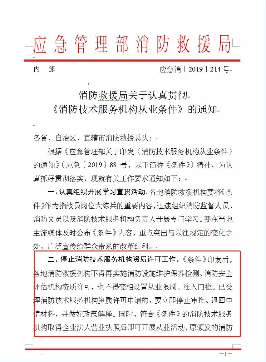 2019年9月5日消防救援局发布关于认真贯彻《消防技术服务机构从业条件》的通知(应急消〔2019〕214号文),通知提出:停止消防技术服务机构资质许可工作。已受理消防技术服务机构资质许可申请的,要立即停止审批、退回申请材料,并做好政策解释。