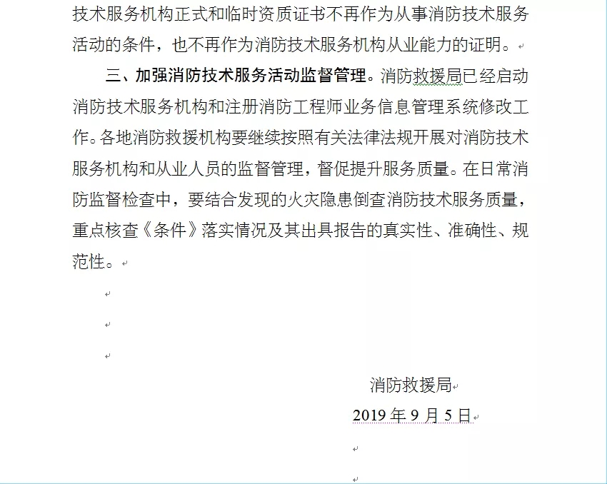 2019年10月21日山东省消防救援总队公布《关于贯彻消防技术服务机构从业条件的通知》,通知明确提出: