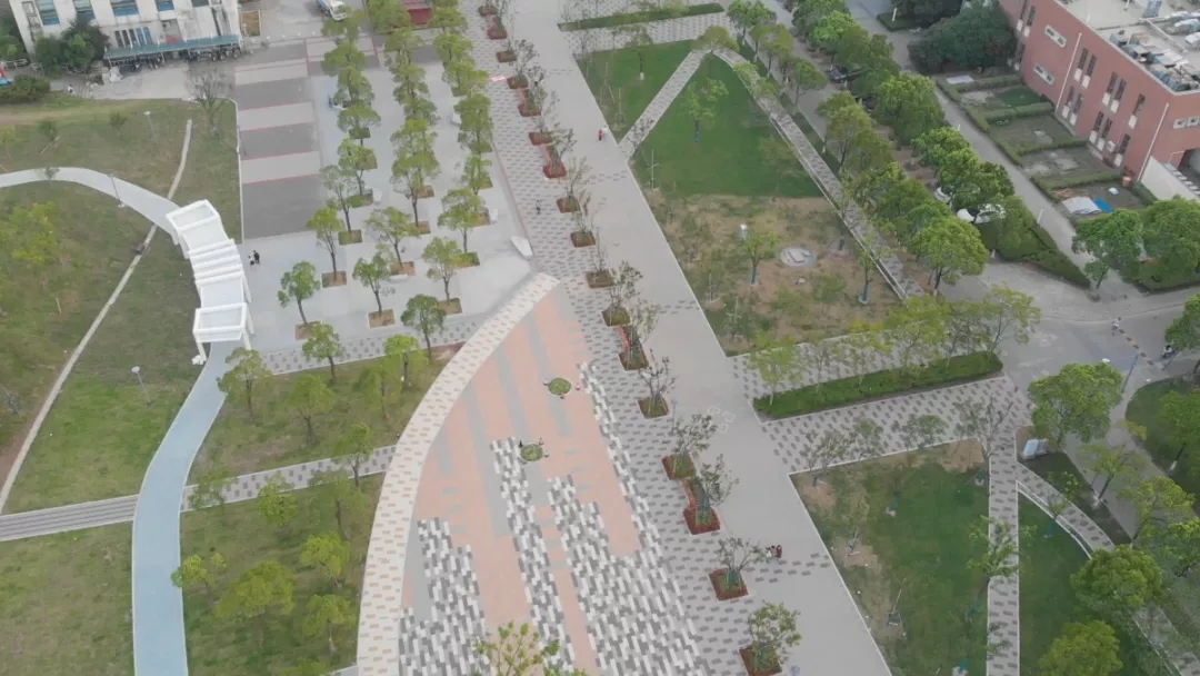 为庆祝学校成立110周年,学校特募集110棵樱花树布置在听涛大道两侧。大道铺装均采用陶瓷透水砖,为师生提供更好的行走体验,做到小雨不湿鞋,大雨不积水。并在人行道侧设置生物滞留带,对雨水进行滞蓄和净化处理。
