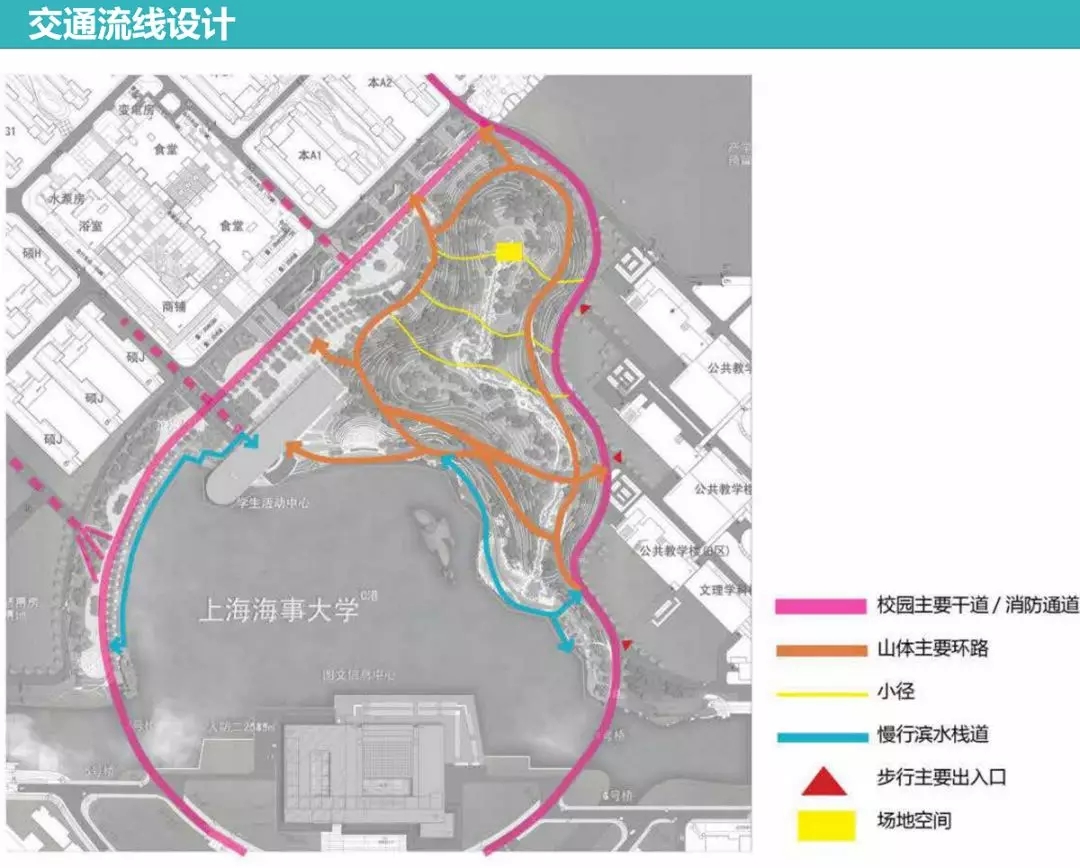 山体原有步道方向为东西横穿绿地通往两侧公共教学楼及食堂等活动空间,原有路线缺乏组织与规划,且部分路段较窄,上下课高峰期学生需侧身通行。设计环路将原有登山小径串联,形成主要的通行环线,有效的解决学生上下课的通行问题;并在景观湖侧增设慢行滨水栈道,使步道也同时具有休闲、游憩的景观作用。