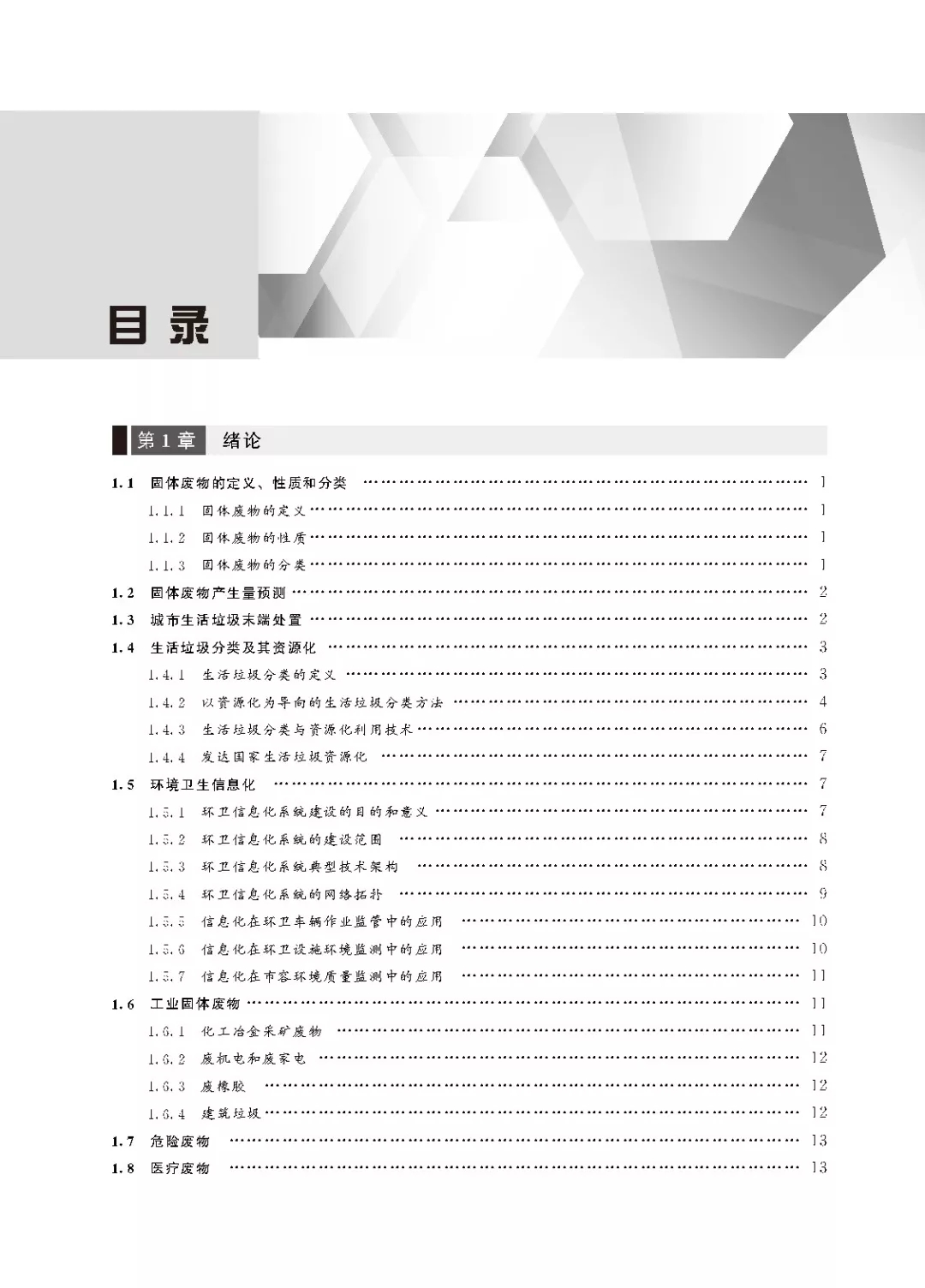 前言 “固体废物处理与资源化”是高等学校环境工程和环境科学专业的一门必修课程。由赵由才、牛冬杰、柴晓利等编写的高等学校教材《固体废物处理与资源化》第二版自2012年3月出版以来,深受读者欢迎。近年来,固体废物处理与资源化应用技术发生了深刻变化,生活垃圾从卫生填埋为主开始向焚烧发电为主过渡,生活垃圾源头分类正在强力推进,危险废物管理日趋严格,全国各地建设并投入运行了成千上万座大中型生活垃圾、危险废物和工业固体废物处理设施。同时,环境卫生信息化和在线监测及监管技术发展迅速,应用广泛,因此,急需对第二版的内容进行修订。 本书第三版对第二版的内容进行了修改补充,增加了近年来固体废物方面的研发和工程应用进展,以生活垃圾和工业废物为主线,力求全面完整地描述固体废物处理与资源化新技术、新方法、新理论。增加的内容包括城市生活垃圾分类与资源化、环境卫生信息化、危险废物处理与资源化、卫生填埋信息化、焚烧发电厂信息化和在线监测等,对一些过时的内容进行了删减。同时,插入必要的二维码动画片,以增加可读性和趣味性。本书的编写分工如下:赵由才编写第1章、第3章、第4章,柴晓利、赵由才编写第2章、第9章,柴晓利编写第5章,牛冬杰编写第6章、第8章、第9章,马文超、柴晓利编写第7章。黄庭梁(环境卫生信息化)、潘慧(生活垃圾焚烧过程信息化)、孙向军(生活垃圾焚烧在线监测)参与了部分内容编写工作。陈彧、戴世金等协助制作了相关动画片。周涛参编部分内容,参与全书文字润色、修改工作。本书可与《固体废物处理与资源化实验》(ISBN 978-7-122-32576-1)和相关在线教材配合使用。 由于编写时间所限,教材疏漏之处在所难免,敬请各位读者批评指正。 赵由才 目录