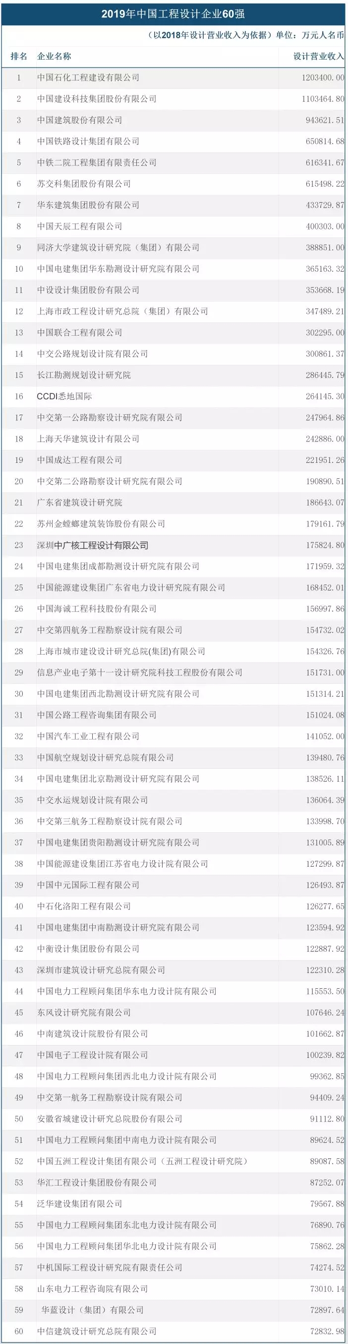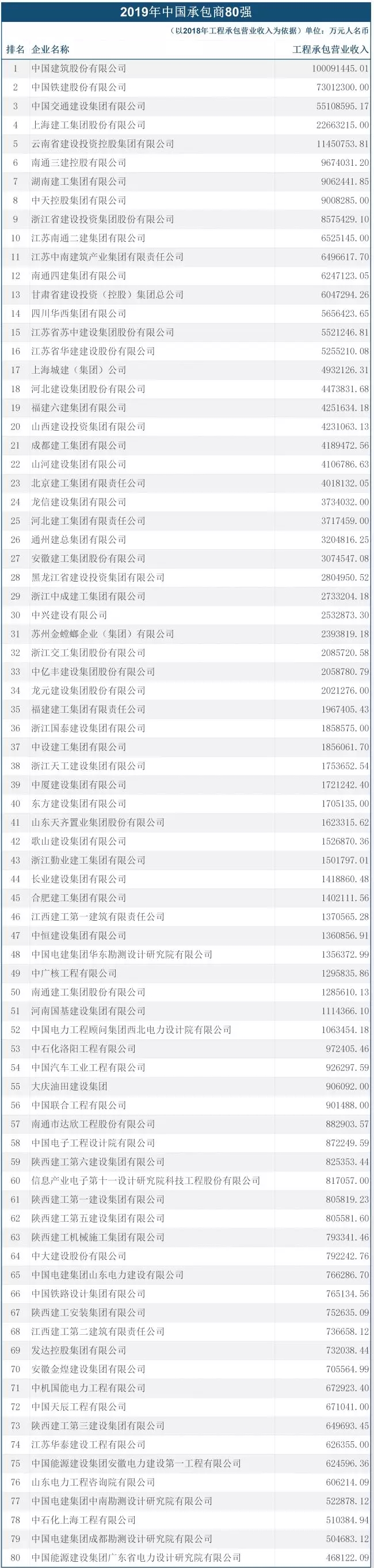 2019ENR/建筑时报“中国承包商80强和工程设计企业60强”全榜单如下:
