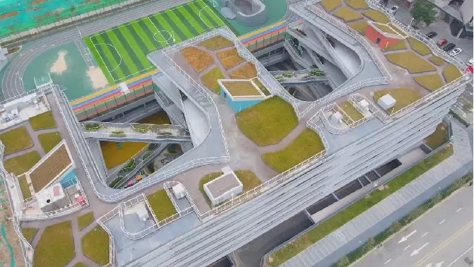 项目特色:被媒体评价为最具有前瞻性、设计感的“未来学校”!学校借鉴了山形的自然流线和高低递进,上下层平面投影错位,再加上顶层的小农场、外立面的攀爬植物、庭院里错落有致的景观,让人置身大自然中。