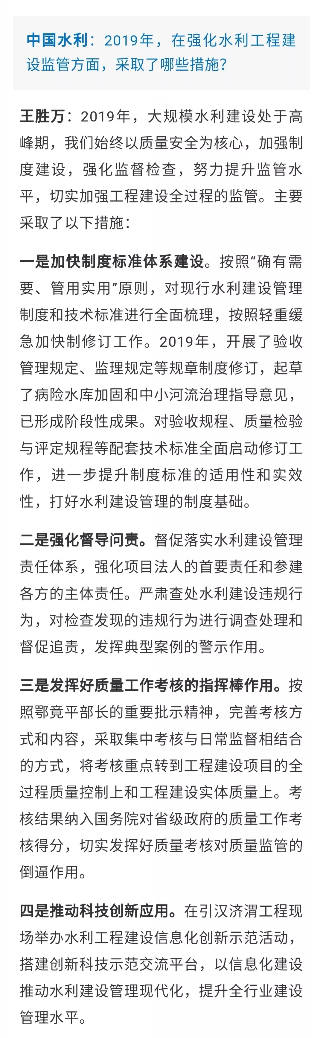 2019年是全面贯彻落实“水利工程补短板、水利行业强监管”水利改革发展总基调的开局之年,水利工程建设工作围绕水利中心工作,坚持目标引领和问题导向,加快推进重点水利工程建设实施,有效管控工程建设质量,大力提升工程建设水平,积极引导水利建设市场良性发展,推动了水安全保障水平明显提升。日前,本刊记者专访了水利部水利工程建设司司长王胜万。