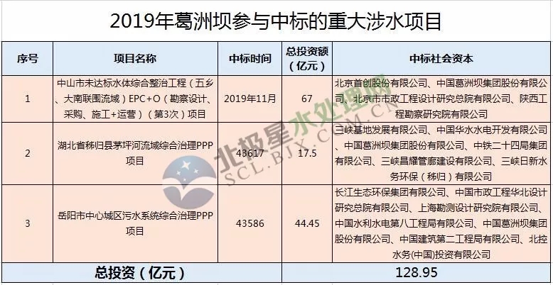 据北极星水处理网不完全统计,2019年,葛洲坝牵头中标的涉水项目总投资逾77亿元,参与中标的重大涉水项目总投资128.95亿元,牵头+参与的重大涉水项目总投资逾205亿。