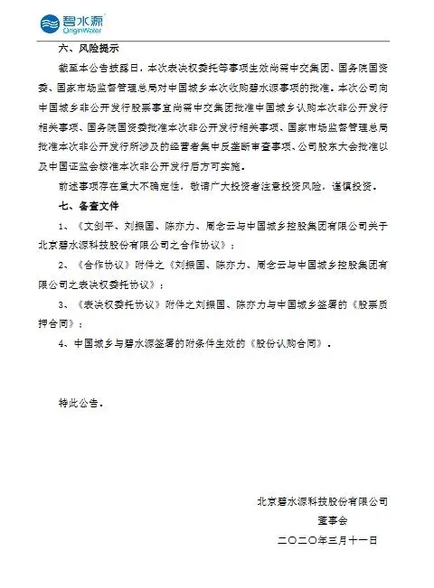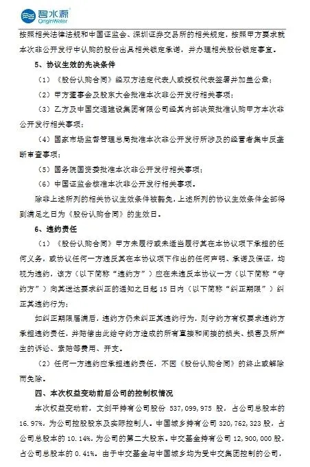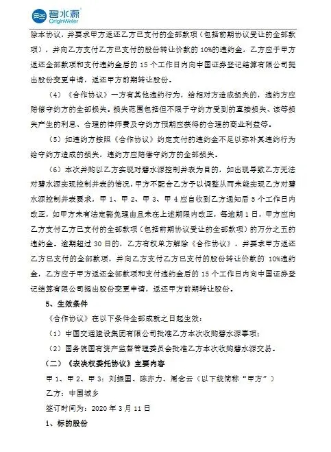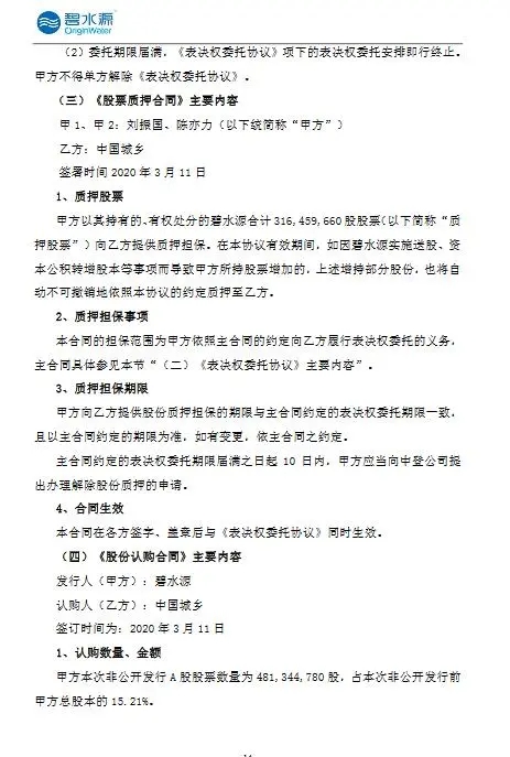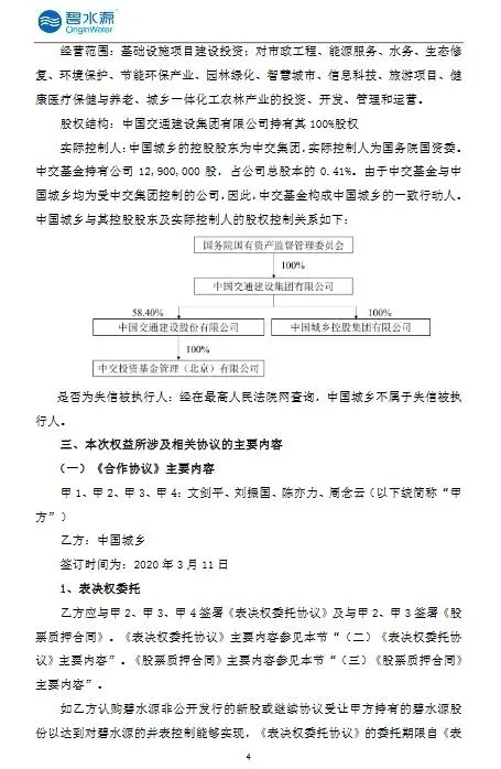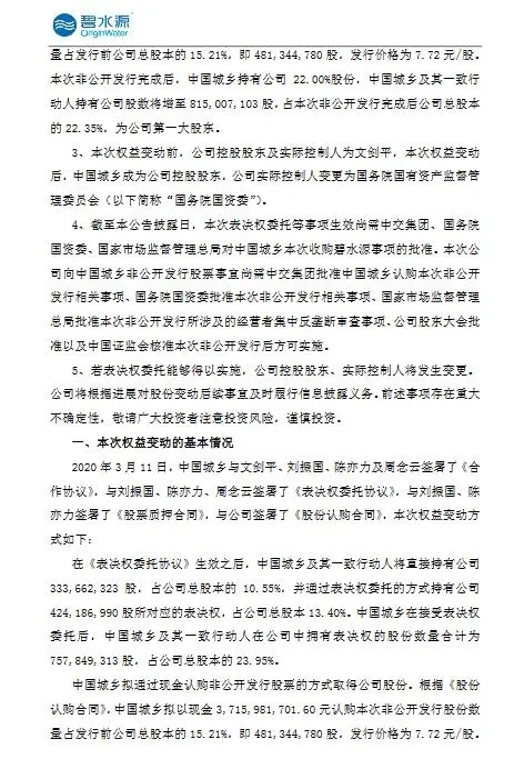 碧水源公布,2020年3月11日,中国城乡与文剑平、刘振国、陈亦力及周念云签署了《合作协议》,与刘振国、陈亦力、周念云签署了《表决权委托协议》,与刘振国、陈亦力签署了《股票质押合同》,与公司签署了《股份认购合同》,此次权益变动方式如下: