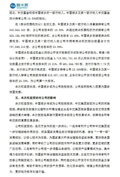 此次权益变动,中国城乡将成为公司控股股东,中交集团实现对公司的间接控股。持续做优做强水处理和水环境治理主业是中交集团服务国家生态文明发展战略的重大举措,此次控股是其践行国有资本投资公司改革试点、发挥混合所有制优势的重要改革实践。