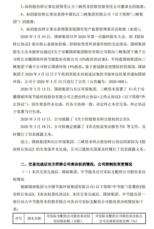 国祯集团的得与失 据最新披露资料,目前控股股东国祯集团持有国祯环保32.45%股份,三峡集团旗下子公司长江生态环保集团有限公司(以下简称“长江环保”)、三峡资本控股有限责任公司(以下简称“三峡资本”)合计持有公司11.62%股份,中节能持股比例为8.69%。 回溯2019年9月,国祯集团与长江环保及三峡资本签署股权转让协议,拟向后者合计转让1亿股上市公司股份,占公司总股本的15%,转让价格为12.7元/股,总价款为12.77亿元。若股份得以如期转让,“三峡系”将持有公司26.6%股份,跃居第一大股东。 然而,这起被视作产业资本深度合作的案例却在半年后 “告吹”。3月13日,国祯集团宣布终止与长江环保及三峡资本之间的股权转让,转而与中节能签署股权转让及表决权委托协议,拟将15%的股份转让给中节能,并将约6.26%表决权委托给中节能行使。据悉,股权转让价格为14.66元/股,总价款为14.75亿元。交易完成后,中节能将拥有国祯环保29.95%的股份表决权。 根据问询函回复,与三峡集团的股权转让卡在了国祯集团的股东大会环节,原因为部分核心条款,包括价格、控制权等受外部条件制约无法落实。 比较上述两份股权转让协议,核心变化聚焦于三大方面:一是转让价款;二是上市公司控制权是否变更;三是有无业绩承诺。 从转让价款来说,相比于“三峡系”,国祯集团将在本次与中节能的股权转让中,将多获得2亿元对价。据介绍,国祯集团进行股权转让的目的是为旗下其他产业发展提供资金支持。记者关注到,除主营环保水务的国祯环保外,国祯集团旗下还控股数十家企业,包括安徽国祯生态科技股份有限公司、国祯置业有限公司、安徽国祯健康产业投资有限公司、安徽国祯环卫科技有限公司、国祯文化传媒有限公司等,涵盖生态循环、环境修复、环境卫生、健康管理和文化教育等行业板块。 从控制权层面来说,“三峡系”曾保证在股权转让后3年内且国祯集团持股比例不低于10%的情况下,仍保证国祯集团的控制地位,而中节能本次受让股权却直奔控制权而来。交易完成后,国祯集团将丧失对上市公司的控制权。具体来看,本次国祯集团在转让15%股权的同时,叠加6.26%的表决权委托,中节能将获得29.95%的表决权,比三峡集团、国祯集团表决权比例高出18.33%、18.76%,控股地位得以稳固;与此同时,后续董事会改组时,在9个董事会席位中,中节能提名或推荐的人选将占5席,拥有半数以上席位,国祯集团仅占据2-3个席位;另外,法定代表人和董事长将由中节能方面人员担任。 值得一提的是,本次与中节能的股权转让及表决权委托附有业绩承诺。国祯集团及实际控制人李炜承诺上市公司2020年度的净利润将不低于3.5亿元,若未达业绩承诺,需按中节能届时持股比例对其进行现金补偿。 记者关注到,2015年-2018年,国祯环保净利润保持快速增长,同比增长率均在40%以上。据国祯环保业绩快报,公司2019年度实现营业收入41.6亿元,同比增长3.86%;净利润3.3亿元,同比增长17.38%,据此测算,2020年净利润增长率需达到6%方能完成业绩承诺。 国祯环保的得与失 中节能和三峡集团均为国务院国资委下属央企,曾于2019年7月合计出资9亿元包揽国祯环保定向增发股份。记者关注到,三峡集团与中节能均深度参与“长江大保护”战略,与国祯环保主业呈现出一定的协同性。 值得一提的是,相比于中节能,三峡集团 “瞄上”国祯环保的时间更为靠前。早在2018年四季度,三峡资本便已通过二级市场增持公司股份,至2019年7月认购国祯环保非公开发行股份前,持股比例已达4.7%。 此番中节能后来居上,产业与资本的合作将激发出怎样的火花?股权交易对方的改变,又将对上市公司业务发展带来哪些影响? 据官网介绍,中节能以节能环保为主业,已构建起以节能、环保、清洁能源、健康和节能环保综合服务为主业的4+1产业格局,在光伏发电、风力发电、固废处理、 工业节能、水处理、建筑节能等领域均居领先地位。目前拥有500余家下属企业,其中二级公司 26 家,业务分布在国内各省市及境外约110个国家和地区。除国祯环保外,中节能还控股节能风电、中环装备(300140)、太阳能、万润股份等A股上市公司。 数据显示,2018年度中节能营业收入为468亿元,净利润为21亿元。 中节能旗下中环保水务投资有限公司、中节能水务发展有限公司涉及水治理领域,与国祯环保存在一定的同业竞争。中节能表示,后续计划逐步向公司注入优质水务资产、参与公司定向增发或委托公司运营其优质水务资产,稳妥推进与上市公司相关业务的整合。 据悉,中环保水务投资有限公司为水务产业系统服务提供商,日处理规模近1100万吨;中节能水务发展有限公司主营供水及污水处理、水务工程、工业废水处理等,供水及污水处理服务能力220万吨/日。 截至2019年半年度,国祯环保已在全国拥有百余座污水处理厂,处理规模524万吨/日,其中在建规模139万吨/日;托管运营规模143万吨/日。若后续中节能相关水治理资产得以注入,国祯环保的产业规模将得到大幅提升。 需要注意的是,资产注入事项尚未有具体计划,也不构成中节能的承诺。 资产注入虽备受期待,但国祯环保与三峡集团业务合作的可持续性却存在一定变数。 记者关注到,在此前国祯集团与“三峡系”的股权转让协议中,曾约定了长江大保护项目相关业务合作。 根据此前约定,长江环保将优先将国祯环保纳入长江