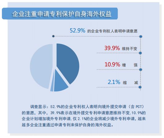 《报告》摘要如下: 2019年中国专利调查概述 一、 基本情况 为全面深入掌握我国创新主体专利活动基本情况,了解社会公众对知识产权公共政策的需求,为我国知识产权政策制定提供支撑和依据,自2008年起,国家知识产权局战略规划司开始组织实施年度中国专利调查工作,由国家知识产权局知识产权发展研究中心等单位承担。2019年中国专利调查范围覆盖我国25个省(区、市),涉及截至2018年底拥有有效专利的企业、高校、科研单位和个人共4类专利权人,及其拥有的发明、实用新型、外观设计3种专利。共发放专利权人问卷1.35万份,专利信息问卷4.25万份,回收有效问卷分别为1.2785万份和3.7308万份,回收率分别为94.7%和87.8%。 二、 全景扫描 1、保护知识产权取得新成效,“严保护”环境正在形成 知识产权体现智力创新成果,保护知识产权就是保护创新。调查显示,我国知识产权保护在提高侵权违法成本、优化保护环境等方面取得新的成效,企业在强化知识产权源头保护等方面的需求旺盛。具体如下: 专利侵权违法成本明显提升。专利侵权诉讼案件法院判定赔偿或者庭审和解金额分布在“10万元至50万元”区间占比为29.4%,较上年增加17.7个百分点,首次超过金额在“10万元以下”占比,成为赔偿或和解金额最集中区间;“10万元以下”占比27.8%,较上年大幅下降15.5个百分点。这表明专利侵权违法成本增加,知识产权司法保护力度进一步加大。 法律威慑作用开始显现。遭遇专利侵权的专利权人中,36.8%选择“自行与侵权方协商解决”,较上年增加7.1个百分点,成为占比最高的维权措施。此外,期望采取的维权措施中,除行政保护和司法保护两条途径的维权措施以外,选择“协商解决”的占比较上年增加7.7个百分点,达到25.8%。上述数据既体现专利权人对快捷、高效纠纷解决机制需求加大,又从侧面反映随着司法保护与行政执法力度的不断加强,我国知识产权“严保护”环境正在形成,法律威慑作用日益凸显,更有利于当事人通过自力救济方式维护自身权益。 电商专利侵权现象有所好转。调查显示,41.2%的专利权人认为电子商务领域专利侵权行为严重,与上年相比下降7.9个百分点。其中,认为“非常严重”的占比14.5%,较上年下降2.3个百分点,认为“严重”的占比26.7%,较上年下降5.6个百分点。自电子商务法颁布实施以来,我国电商运行秩序更加规范、有序,知识产权保护更为严格,遏制了电商平台专利侵权等违法行为。 严格保护获专利权人认可。73.1%的专利权人认为,目前国内知识产权保护水平需大幅或逐步强化,近年来占比首次低于8成,较上年下降9.1个百分点。认为现今保护水平比较适当的专利权人占比近两年逐步上升,占比达到23.6%,较上年增加10.2个百分点。这表明随着知识产权保护政策法规以及工作体系的不断完善,我国知识产权保护水平大幅提升,严格保护效果获专利权人进一步认可。 企业期盼加强知识产权源头保护。调查显示,62.2%的企业专利权人认为专利申请周期长,赶不上技术发展的速度,占比较上年增加6.5个百分点。这表明随着我国新技术、新产业加速迭代升级,企业快速获得专利授权期望更加迫切。 综上所述,为促进我国知识产权保护水平不断提升,提出以下三个方面建议:一是进一步加强知识产权源头保护,着力提高知识产权审查效率,满足创新主体迫切需求;二是加大行政查处和处罚力度,开展常态化专项打击行动,持续强化专利行政执法保护;同时,培育、发展仲裁机构和调解组织,充分发挥知识产权纠纷协调解决优势,健全行政确权、仲裁、调解、行政执法以及司法保护之间的衔接机制,实现司法诉讼、行政处理、仲裁、调解、行业自律等多种纠纷解决方式的有机统一,形成共建共治知识产权保护模式;三是利用实时监测、在线识别等技术手段,加强电子商务领域知识产权保护,制定完善电商平台保护相关管理标准,提升打击电商平台侵权假冒行为效率及精准度,进一步优化电子商务领域营商环境。 2、九成以上专利权人认可专利无效宣告程序 在专利法第四次修改过程中,有观点认为专利无效宣告程序复杂,专利无效宣告程序的制度设计再次成为社会公众关注的重点内容之一。调查显示,92.2%的专利权人认可专利无效宣告程序的法律作用及意义。具体如下: 行政纠错是专利无效宣告程序的首要属性。认可专利无效宣告程序的专利权人中,33.6%认为专利无效宣告程序“是行政纠错程序,为维护专利权授予的公正性发挥重要作用”,占比最高。其次分别为“向专利权人提供修改专利文件的机会,体现了专利法鼓励发明创造的立法宗旨”,以及“为侵权判定提供支撑,提升了诉讼纠纷的解决效率”,占比分别为30.7%和27.8%。 遭遇侵权的专利权人更加认同无效宣告程序在司法判定中的积极作用。数据显示,遭遇过专利侵权的专利权人更加认同专利无效宣告程序为侵权判定提供支撑,提升了诉讼纠纷的解决效率,占比32.5%,高出未遭遇过专利侵权的专利权人5.4个百分点。 战略性新兴产业最认可行政补救作用。战略性新兴产业企业认可专利无效宣告程序的比例达到93.0%,较非战略性新兴产业高出1.4个百分点。其中,在“向专利权人提供修改专利文件的机会,体现了专利法鼓励发明创造的立法宗旨”方面的认可度最高,占比为34.6%,较非战略性新兴产业企业高出4.2个百分点。 外资、港澳