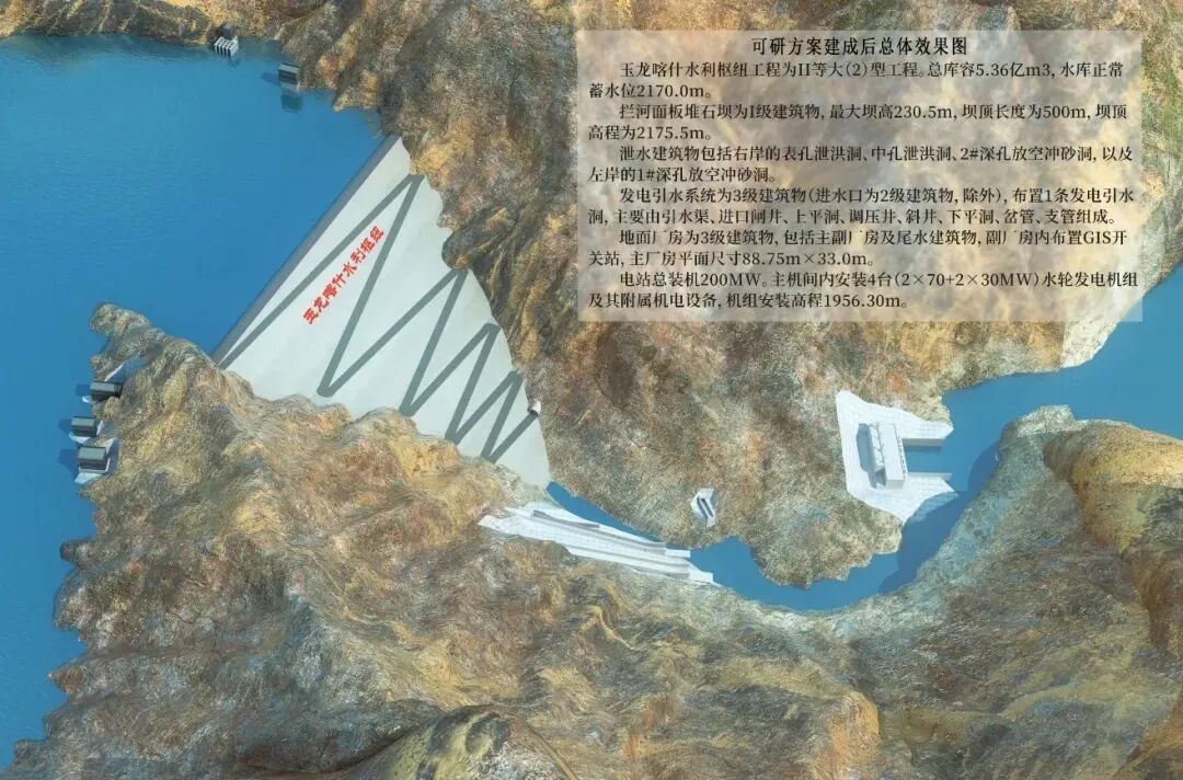 玉龙喀什水利枢纽工程位于新疆和田县喀什塔什乡辖区内,以生态输水、灌溉补水为主,结合防洪,兼顾发电等综合利用,是国务院确定的172项节水供水重大水利工程项目之一。该工程最大坝高为230.5米,水库总库容5.36亿立方米,电站装机20万千瓦。