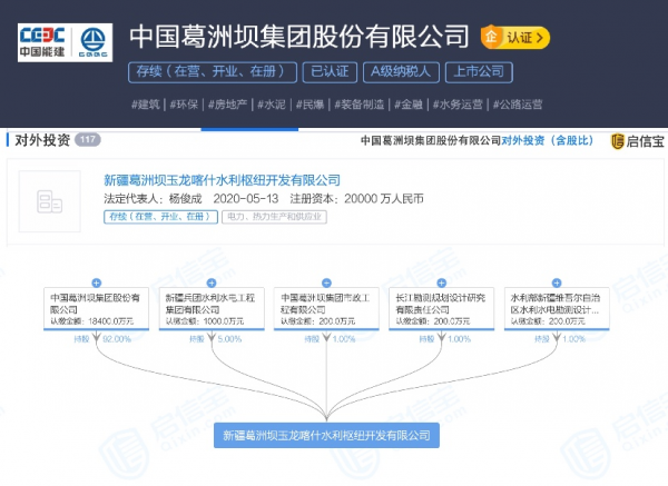 5月13日,中国葛洲坝集团股份有限公司与新疆兵团水利水电工程集团有限公司、中国葛洲坝集团市政工程有限公司、长江勘测规划设计研究有限责任公司、水利部新疆维吾尔自治区水利水电勘测设计研究院合资成立新疆葛洲坝玉龙喀什水利枢纽开发有限公司,认缴金额分别为18400万元、1000万元、200万元、200万元、200万元,持股比例分别为92%、5%、1%、1%、1%。