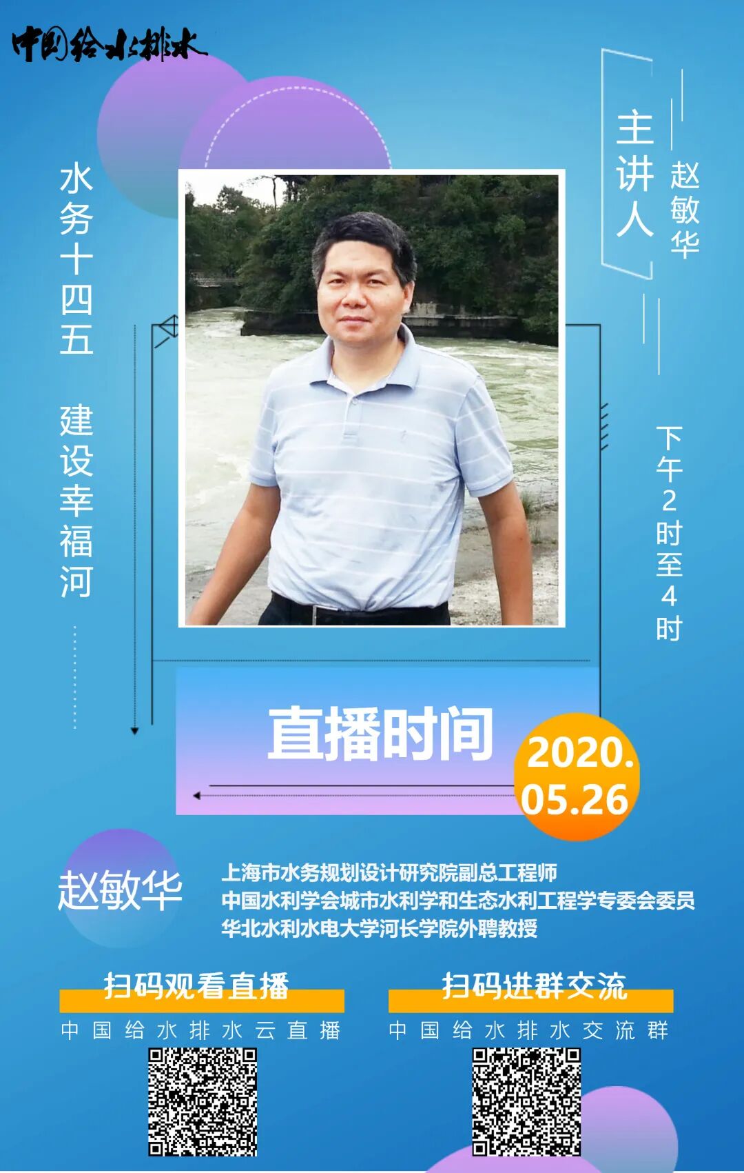 赵敏华,上海市水务规划设计研究院副总工程师,中国水利学会城市水利学和生态水利工程学专委会委员,华北水利水电大学河长学院外聘教授;1989年研究生毕业于河海大学环境水力学专业,从事水务规划研究30年。最近10年全国各地会议报告和培训讲课200多场。全过程参与江苏镇江和浙江温岭的海绵城市规划设计和建设管理。负责的《世博园区水务专业规划》《新江湾城水生态系统建设研究》获全国优秀工程咨询成果二等奖、上海市科学技术进步二等奖等。